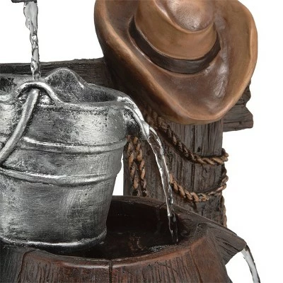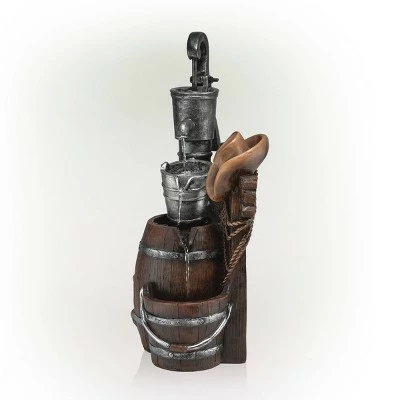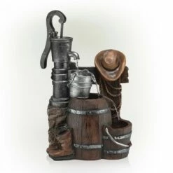 Add a touch of vintage fun to your outdoor space with the Alpine Corporation 26″ tall Outdoor Vintage Pump and Barrel with Cowboy Hat Fountain Yard Art Decor. The design adds an old-fashioned rustic element to your space. This outdoor fountain looks great in your garden, patio, deck, porch, or yard space. The polyresin construction is weather-proof, rust-resistant, and durable for years of quality use. The fountain has a traditional water pump that provides water to the wood barrels. Relax to the sounds of the soft, natural water flow as it streams from the pump to the barrels. This classic standing fountain provides a look back in history and is a great addition to your courtyard or pool deck area. The fountain gives your garden or lawn visual interest with its timeless design and old-timey style. For quick install and convenient operating, the fountain includes all necessary parts and a pump, to begin creating an outdoor oasis. This fountain measures 14″L x 11″W x 26″H to fit almost any outdoor space and includes a one-year manufacturer’s warranty from date of purchase. Alpine Corporation is one of America’s leading designers, importers, and distributors of superior quality home and garden decor products. Alpine’s award winning in-house design team continuously develops new and innovative “statement pieces” for your home and garden. Your outdoor living spaces will be the envy of the neighborhood with our wide assortment of fresh, fashionable and contemporary products, from beautifully crafted solar garden stakes featuring patented motion and fiber optic lighting technology to gorgeous glass and glow-in-the-dark birdbaths and feeders.