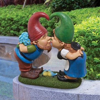 Though flower-carrying Papa Gnome has some explaining to do, his wife is already prepared with an iron clad response behind her back! Iconic from their pudgy cheeks to the pointed caps that touch in a heart shape, these Design Toscano love-bird garden gnomes add a mythical romantic magic to flower bed, woodland deck or anywhere these lucky Germanic dwarfs might be welcomed. Cast in quality designer resin, they are hand-painted in forest hues to make any heart more cheerful. Happy gnome wife, happy gnome life! Don’t take the frying pan, a great gift for that “new” couple with a new home.