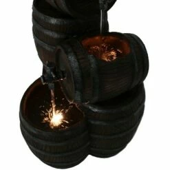 Give any garden and landscape country charm with this outdoor water feature. The authentic look of the metal rings and wood grain texture of barrels is perfectly replicated by the lightweight and strong polyresin material. Relax and unwind as water flows from the taps on the barrels into the bottom barrel. Everything necessary to assemble this fountain is in the box, including the electric submersible pump. Plus, no complicated prep work or plumbing is required to set up this fountain so it can be enjoyed right away. Images include product in nighttime environment.