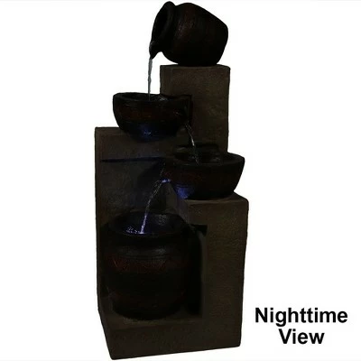 Bring relaxation and serenity to any outdoor space with a new solar power water fountain. This feature is constructed with a sturdy polystone material that is designed to look like four pouring bowls. Watch as the water softly flows from the top all the way down to the bottom bowl where it then recirculates back through with help from a solar pump. Simply assemble, fill, and enjoy the ambiance and relaxation that it will bring. If fully charged, the batteries will power up to 4 hours. When the batteries are depleted, the system will automatically switch to be powered by the solar panel, and will resume running when the sun comes out. Images include product in nighttime environment.
