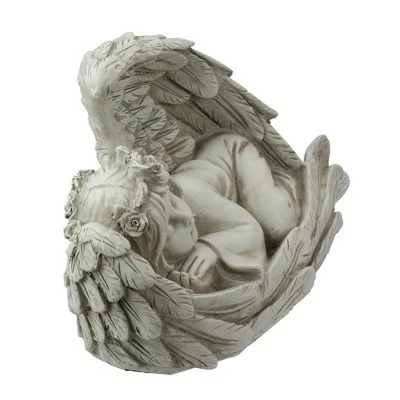 Whether used in the garden, on the patio, or inside on a mantle place, this angel statue is sure to add character to any space. Featuring a little angel nestled inside the comfort of her own wings. You can use this little memorial anywhere as a remembrance of a loved one. Truly makes a thoughtful gift for a friend or family member who has lost someone special.Product Features:Sleeping heavenly angel garden statueGray weathered, distressed finishAngel is tucked safely inside on her own wingsPerfect for memorials, patios, or on mantle placesMeticulously sculpted by highly skilled artisans with fine attention to detailRecommended for indoor or outdoor useDimensions: 8″H x 16″W x 5″DMaterial(s): polyresin