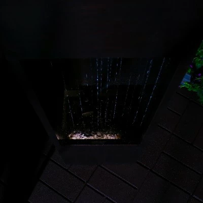 - Features accent lighting at bottom to highlight falling water