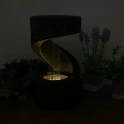 Bring modern style and soothing water sounds to any indoor space with this tabletop fountain. Featuring lightweight and easy-to-maintain polyresin construction, this fountain can easily be placed in your desired location. This water feature makes a wonderful addition to personal spaces at home or the office. It also features LED lighting at the bottom of the basin that beautifully illuminates the shower of water in the center. Everything is included for setup, such as the fountain and the electric submersible pump. Plus, assembly is easy with no plumbing required. Images include product in nighttime environment.
