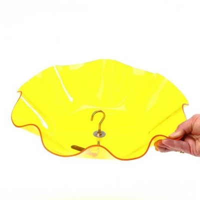 - CLEAR DESIGN: The yellow tinted translucent acrylic material allows birds to see food in the feeder below The clear design and decorative scalloped edges make this accessory appealing to both you and your feathered friends