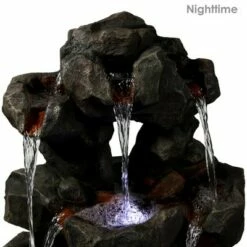 The outdoor water fountain with LED lights is made from a durable polyresin and fiberglass material that is crafted to look like a stone waterfall. It is painted in colors of gray, green, brown, and ivory and features 3 LED lights. The electric pump enables the gently flowing water to flow from the top tier all the way down to the bottom pool where it then recirculates back through the fountain. Whether the fountain is placed in the garden, on the patio, or on the deck, this feature is sure to leave a beautiful lasting impression. Images include product in nighttime environment.
