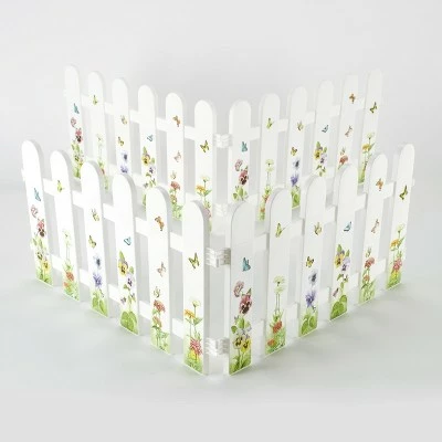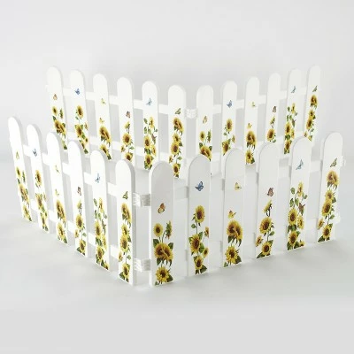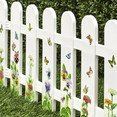 Accent your yard or garden with this decorative fence. It features beautiful images of butterflies, hummingbirds or sunflowers on the white pickets. Use this fence along the sidewalk, to draw attention to a landscape feature, to mark your property line or in many other ways around your yard. This garden decoration consists of 4 panels that can be hooked together in a straight line or in a square. Order multiple sets to create a longer fence. Assembly required; assembly hardware included. Each panel has a 3-5/8″ long stake at the bottom. Simply push it into the ground. Butterfly, each panel, 23-3/8″W x 1/2″D x 14-1/2″H. Sunflowers and Hummingbird, each panel, 23-3/4″W x 1/2″D x 11-3/8″H. Plastic.