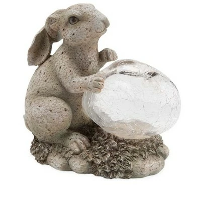Someone’s found something very special! Our Bunny Sculpture with Solar Lighted Crackle-Glass Orb depicts a darling little rabbit keeping an eye on his newest treasure. We don’t know where he found this crackle-glass orb, but he’s so excited about it that his ears have braided themselves together! Wait until after dark when he learns that his new toy starts to glow, thanks to a discreet solar panel that powers lights within the orb. A delightfully fantastical piece to add some whimsy to any garden, this fun piece is cast in weather-resistant resin for year-round outdoor display.