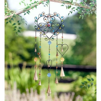 This Colorful Heart Wind Chime has it all: delicate wire hearts adorned with colorful beads and a dozen golden bells to softly serenade you when the wind blows. The top features an ornate metal wire heart embellished with wire curlicues and colored beads while five beaded chains hang below. Each chain has a combination of beads and bells, with three of them bearing their own wire hearts. It certainly won’t take much of a breeze to begin the soothing chiming of the bells, but even on a still day, this lovely chime will warm your heart with its beauty.
