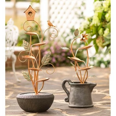 Enjoy the soothing sounds of flowing water whenever you’re near our Lily in Pitcher Indoor/Outdoor Fountain. Water flows from the beautifully sculpted copper-colored metal lily, down over several metal leaves and into the weather-resistant resin pitcher. The leaves are treated with a greenish hue, and the pitcher has a finish resembling dark gray weathered metal. The integrated electrical pump operates on a standard UL-rated power cord. For indoor or outdoor use.
