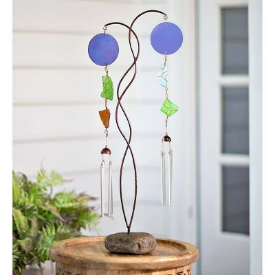 Our Metal and Glass Double Wind Chime is truly a work of sculptural art that will delight the eyes AND the ears. Gracefully curving copper-colored metal rods rise from a real river rock base to suspend colorful recycled glass shards and two sets of aluminum bar chimes. Lovely in the garden, a sunroom or on a coffee table this unique chime is handcrafted by artisans in Bali from a mix of new and reclaimed metal and recycled glass in blue, green and amber colors. The two sets of four aluminum bars create a soothing tone when the breeze blows. A unique and thoughtful gift for any occasion.