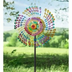 This Rainbow Feathers Wind Spinner is a delight to watch. Dozens of tiny feathers in a rainbow of colors give this bright spinner presence and character. The spinner is painted bright yellow on the back side of each rotor. Two bi-directional rotors create a flurry of movement and color in the breeze. Each feather is finely cut with lots of detail. Multiple layers of feathers form the rotors and the center of the spinner, resembling a flower. The brilliant color adds drama to your garden any time of year. When the breeze blows, this spinner becomes art in motion. Try it in the yard, near the entrance, by the deck or next to the mailbox. It’s a statement that can’t be missed! Metal with a sturdy three-prong ground stake..