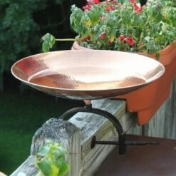- POLISHED COPPER BIRDBATH BOWL WITH OVER RAILING BRACKET: This shallow birdbath has a classic round hammered or “peened” texture, it is ideal for bird-watching on porches, balconies or decks