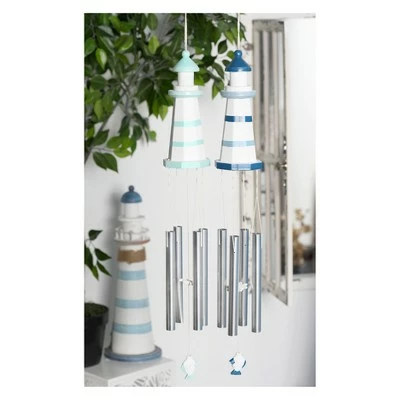 - Wooden lighthouse wind chimes lend a calming coastal vibe