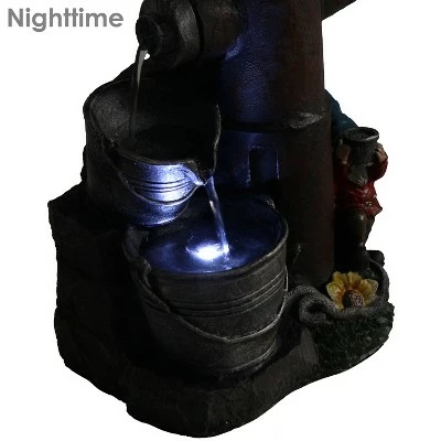 Add a touch of charm to your garden, patio or front porch with the adorable Sunnydaze Fire Hydrant Gnomes Outdoor Fountain with LED Light. This delightful patio fountain is made of durable yet lightweight polyresin and features two playful gnomes climbing up a fire hydrant to get a bucket of water. The vibrant colors and cute figures are sure to complement any outdoor decor. This deck fountain features a convenient electric submersible pump making it simple to set up with no plumbing installation required. The water falls from the hydrant spout and is circulated through the electric water fountain. Images include product in nighttime environment.