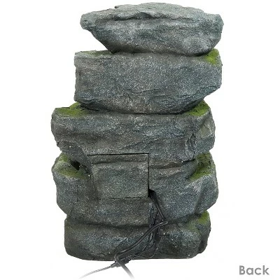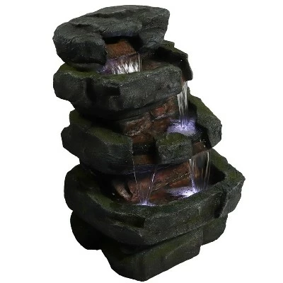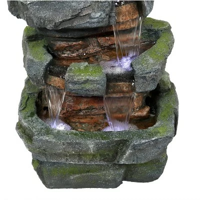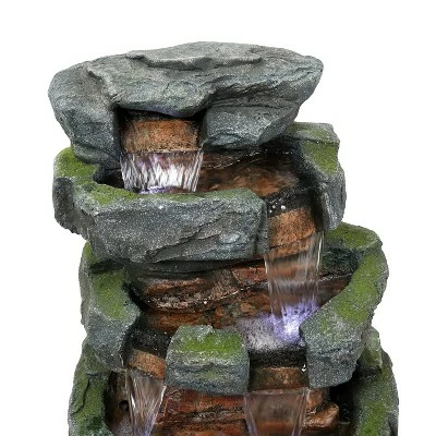 This outdoor water fountain with LED lights is made from a durable polyresin and fiberglass material that is painted to look like a waterfall so it is sure to look great on the patio, or in the garden. The electric pump enables the gently flowing water to flow from the top tier all the way down to the bottom pool where it then recirculates back through the feature. It is painted in colors of gray, green, and brown and features an LED light in the bottom.