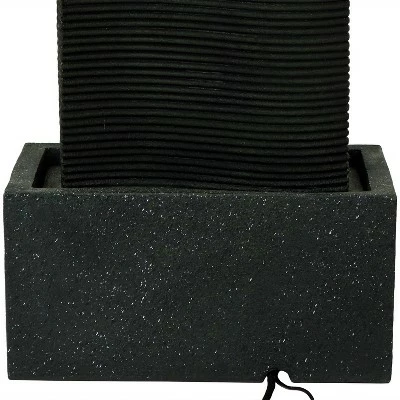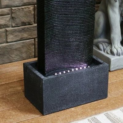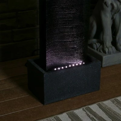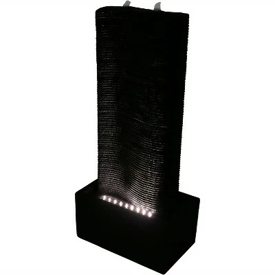 Enhance any garden or patio with this impressive lighted water feature. Made of lightweight and durable polyresin, this fountain can easily be moved to an ideal location, yet can withstand the elements outside. Atop the center column, water bubbles up in two spots and then flows down the textured ridges. The basin features lights that highlights the water as it falls down the sides of the column. This beautiful fountain does not require any complicated plumbing or installation, thanks to the included electric submersible pump. Images include product in nighttime environment.