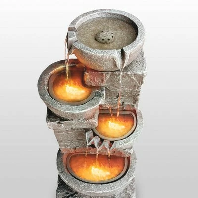 Create a relaxing oasis with the Teamson Home 33″ Stacked Column Floor Fountain. This decorative water fountain features four tiered bowls along a stacked stone-look column to add tranquility to your indoor or outdoor space. The realistic stone textures create a more natural look, and the built-in warm LED lights illuminate the fountain to add ambiance to your decor. The soothing sound of running water flowing along the tiers provides a relaxing atmosphere while blocking out other noises. The durable polyresin construction is weatherproof and rust-resistant for long-lasting indoor or outdoor use. This fountain includes a UL-listed recirculating pump, 72″ power cord, and all parts needed for quick and easy setup. This free-standing fountain measures 16.25″ x 15.5″ x 33″ with a recommended water capacity of 6.6 gallons.