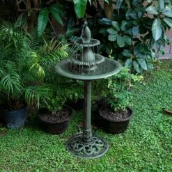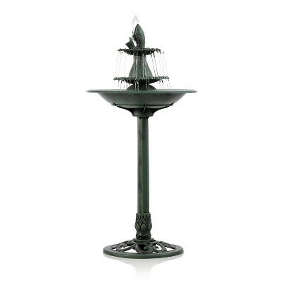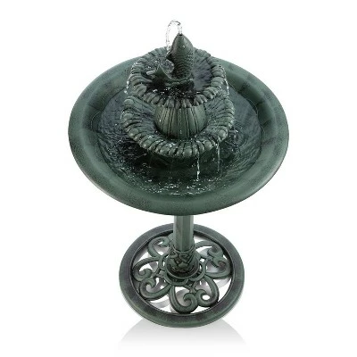 Beckon feathered friends to your yard with the Alpine Corporation Tiered Pedestal Fish Fountain Birdbath. Fill the bath with fresh, shallow water and enjoy watching all the birds congregate near your patio, garden, deck, yard, or pool! This high-quality birdbath features a stunning teal hue with an antique finish and fish detail β great for adding a pop of color to your outdoor decor. It is perfect for pairing with a bird feeder to coax a variety of birds outside your window during any season. The soothing water flow across the three tiers will help you relax and enjoy the outdoors on a nice summer day. The sturdy pedestal keeps the birdbath from tipping over while the resin construction withstands weather changes. Your yard will be the delight of humans and winged creatures alike! With a 1-year warranty, you can be confident in the quality of your purchase. Fountain measures 20″L x 20″W x 40″H for use in yards of any size. Alpine Corporation is one of America’s leading designers, importers, and distributors of superior quality home and garden dΓ©cor products. Alpine’s award winning in-house design team continuously develops new and innovative “statements pieces” for your home and garden. Your outdoor living spaces will be the envy of the neighborhood with our wide assortment of fresh, fashionable and contemporary products, from beautifully crafted solar garden stakes featuring patented motion and fiber optic lighting technology to gorgeous glass and glow-in-the-dark birdbaths and feeders.