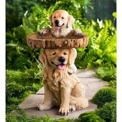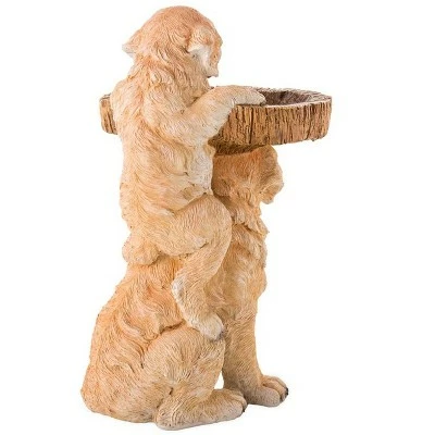 Our design team perfectly captured the essence of puppyhood in this adorable Playful Puppies Birdbath. Two delightfully detailed Golden Retrievers hold a wooden-look basin for your feathered friends. Their doggie smiles and pink tongues add character to their expressive faces. You’ll love it, and the birds will love too, with a 1ΒΌ” basin for splashing around. Meticulously painted weather-safe resin birdbath has a 360ΒΊ design that looks great from any angle. This wonderful piece would be at home indoors too, to hold keys, leashes or other items near an entry door. All-weather resin.