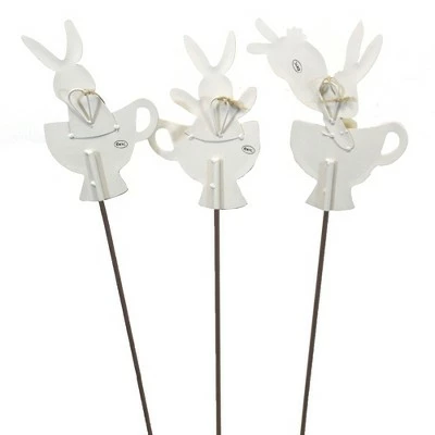 Set Of Three Decorated Easter Teacup Bunny Garden Stakes. White Bunny With Open Arms Sits In A Green Tea With White Egg Design With Orange And Pink Accents. White Bunny Jumping Into A Pink Teacup With White, Yellow, Purple And Blue Accents. White Bunny Looks Out Of A Blue Teacup With Pink And Yellow Flower Accents. Lightly Glittered.. New. Measurements 25.5 In H X 7 In W X .25 In D. . Made Of Metal. Assembly Required, No Tools Needed. Indoor Or Outdoor Use. Imported. NOTE: Not A Toy, For Decorative Use Only.