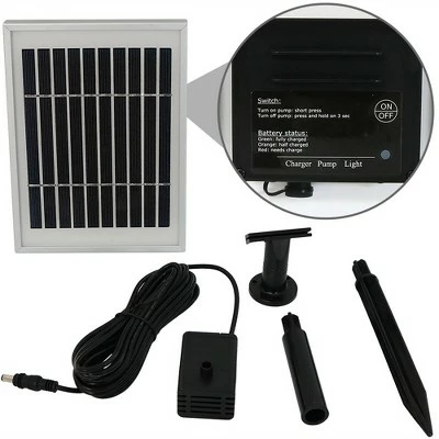 - Includes 1 fountain, 1 quiet submersible pump, (1) 16′ cord, and 1 solar panel