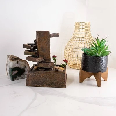 Unwind from the day and meditate to the sound of flowing water with Alpineβs 11″ Tall Indoor/Outdoor Zen Tabletop Tiered Stone Water Fountain with Mini Plant Holder. This modern zen tabletop style fountain statue provides a tranquil and soothing addition to your porch, patio or home office. Constructed from durable resin and stone powder, the fountain is weatherproof, rust-resistant, and resilient and can be used in your home’s interior dΓ©cor or outside. This unique and versatile decor piece will provide a tranquil and soothing addition to your homeβs backyard, indoor or office decor. Replicating a traditional zen garden, the fountain has a natural aged stone appearance, comes with river stones and a mini holder perfect for planting you favorite flower, plant or herb. Relax to the sounds of the soft, calming natural water flow as it trickles down from the top tier of the fountain all the way down the tiers to the rocks below. Not only will the fountain provide you with serenity, it will help soothe and relax throughout the day and evening. This modern and contemporary style fountain provides a perfect addition to your courtyard, patio, or yard, and gives your garden or tabletop visual interest with its natural waterfall style. For quick install and convenient operating, the fountain includes all necessary parts and a pump, to begin creating an outdoor oasis. This fountain measures 9″L x 8″W x 11″H to fit almost any indoor or outdoor table space and includes a one-year manufacturer’s warranty from date of purchase.