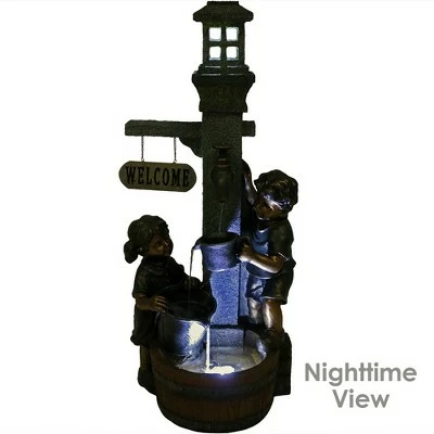 Add whimsy and charm to any patio or yard with this elegant fountain featuring playful children gathering around the water faucet to fill up their buckets after an afternoon full of sun. This outdoor garden fountain is sure to add a lighthearted, carefree feel to any outdoor space. There are two LED lights; one is electric and located in the bottom “basin” reflecting in the water and lighting up the decor piece at night. The other is a solar light located in the top gray “window”, charged by the solar panel located at the top of the fountain. Charges during the day via sunlight and the on/off switch located near the solar panel turns the light on and off easily. Once the fountain is in-place and filled, simply plug it into a standard electrical outlet. Images include product in nighttime environment.