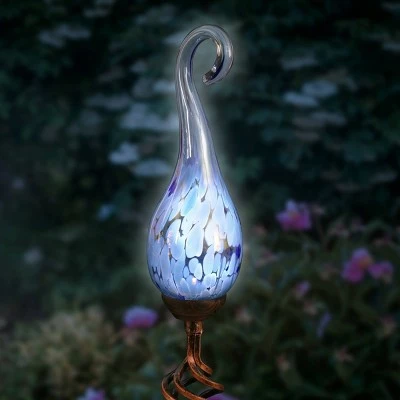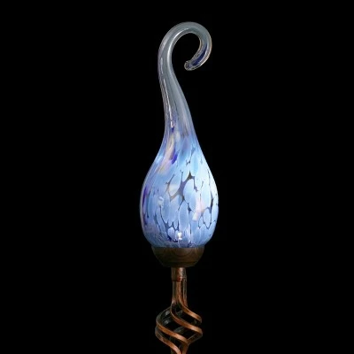 Add a touch of color and light to your garden with an elegant Solar Pearlized Glass Spiral Flame Garden Stake in Dark Blue. A Solar powered LED will automatically illuminate the glass every evening adding a beautiful glow to your garden. Β A perfect addition to your landscape! Exhart hand blown glass pieces are one-of-a-kind and present with slight color variations.
